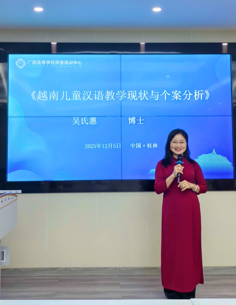为促进学术交流与国际视野拓展,2025年12月5日下午,由广西高等学校师资培训中心主办的“访问学者博雅讲坛”在育才校区顺利举行。本次讲座特邀广西师范大学访问学者、越南河内大学中文系教师吴氏惠博士担任主讲,主题为《越南儿童汉语教学现状与个案分析》。来自广西师范大学的越南留学生代表及访问学者代表参与交流。
