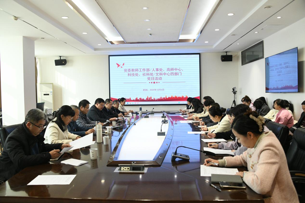 为持续深化党纪学习教育,深入学习贯彻党的二十届四中全会精神,增强党员干部的纪律意识和廉洁从政意识,2025年12月6日上午,党委教师工作部/人事处、广西高等学校师资培训中心、科技处、社会科学研究处/文科中心四个部门的党员同志联合开展12月党日活动。会议由党委教师工作部/人事处、高师中心、广西高师研究会联合党支部书记主持,机关党委纪委书记到会指导,四个部门的党员在育才校区图书馆广西文科中心312会议室参加活动。