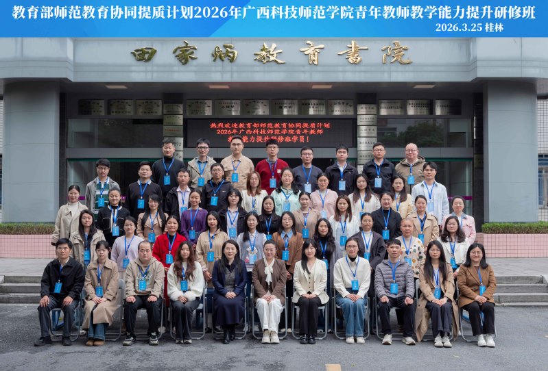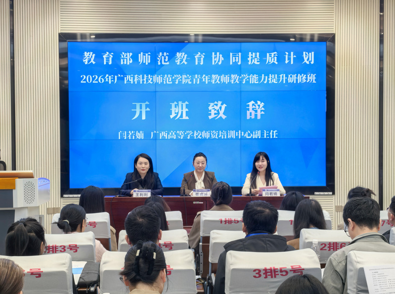 为深入学习贯彻党的二十届四中全会关于办好人民满意教育、建设高质量教师队伍的部署,贯彻落实教育部师范教育协同提质计划部署要求,切实提升广西科技师范学院青年教师教学能力与专业素养,3月25日,由广西科技师范学院主办、广西高等学校师资培训中心承办的“教育部师范教育协同提质计划2026年广西科技师范学院青年教师教学能力提升研修班”在广西师范大学开班。广西科技师范学院未来教师学院(教师发展中心)党支部书记、副院长、副主任(主持工作)崔竞源,广西高等学校师资培训中心副主任闫若婻,及50名广西科技师范学院青年教师参加开班仪式,仪式由广西高等学校师资培训中心副教授王利利主持。